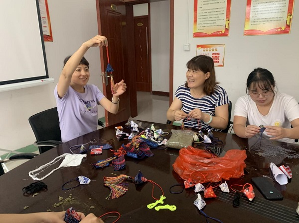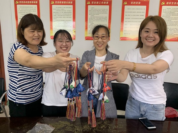在傳統(tǒng)習俗中,玲瓏可愛的各色香包也是端午節(jié)必不可少的元素。包完粽子后大家轉移陣地到了活動室,大家圍坐桌邊,面前堆放著一份份材料包,有棉布、艾草、針線、中國結流蘇。面對這個從來沒有做過的DIY,大家開始研究起來,有的用手機搜索縫制方法流程,有的直接比來比去親自摸索著縫起來。有職工說:“這有點像咱們小時候老人們縫的毽子,那個里面裝的是五谷雜糧,咱們現(xiàn)在裝的是艾草?!薄斑@香囊可以掛在辦公室或者車上,有清香、驅蚊的功效。”“我算是知道了,這個流蘇應該縫在這個邊的中間,而不是角上……”大家你一句我一句,手中的針線穿梭在棉布間,用密密的針腳縫制出傳統(tǒng)佳節(jié)最好的注解,用絲絲線線纏繞出端午安康的美滿寓意,一個個精巧可愛的三角香囊在大家的努力下完美呈現(xiàn)。