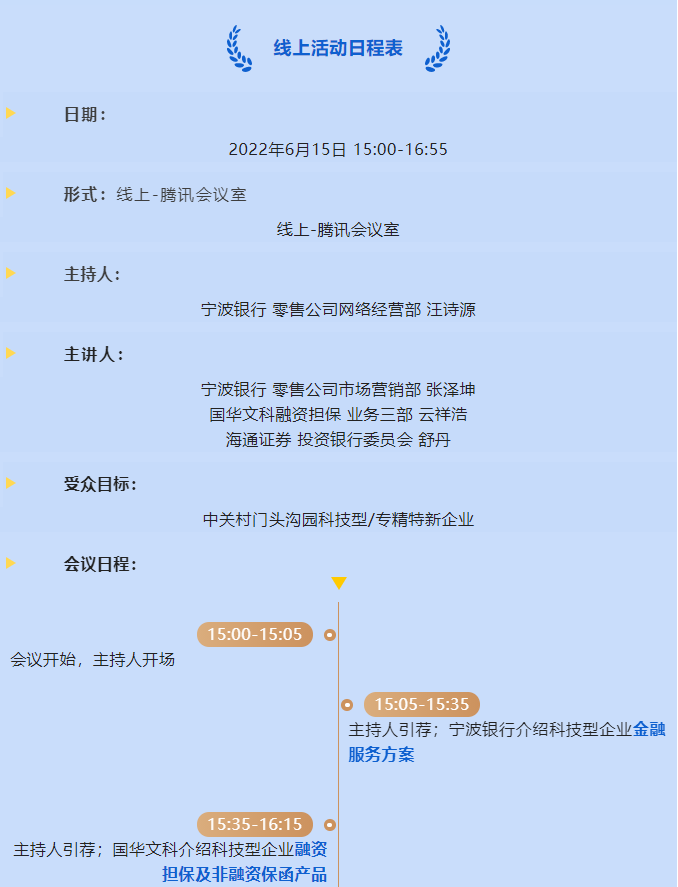 為創(chuàng)新銀政企對接平臺,引導(dǎo)金融機(jī)構(gòu)和有融資需求的企業(yè)“面對面、零距離”對接,精準(zhǔn)破解中小微企業(yè)融資難、融資貴、融資慢的問題,讓更多金融“活水”高效快捷注入到實(shí)體經(jīng)濟(jì)中,6月15日下午3點(diǎn),中關(guān)村門頭溝園金融超市將推出最新一期“政策解讀+創(chuàng)新產(chǎn)品推介”的線上活動——探索多元化融資路徑。